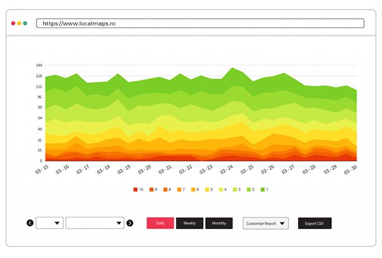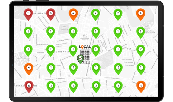 Optimizam modul în care vă poziționați în diferite părți ale orașului. Scanam mai multe puncte la distanțe diferite de afacerea țintă ,le afișam simultan pe o hartă Google, apoi optimizam afacerea in functie de dificultate.