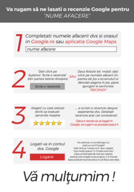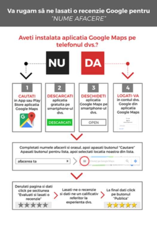 Instrucțiuni de imprimare pentru a lăsa o recenzie Google, pe desktop și mobil.
